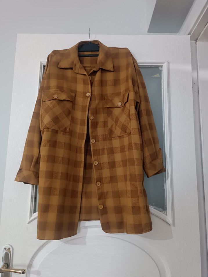 Kahverengi keten kumaştan, düğmeli önü ve uzun kollu, salaj rahat 69 cm koltuk altı 80 cm uzunluğunda