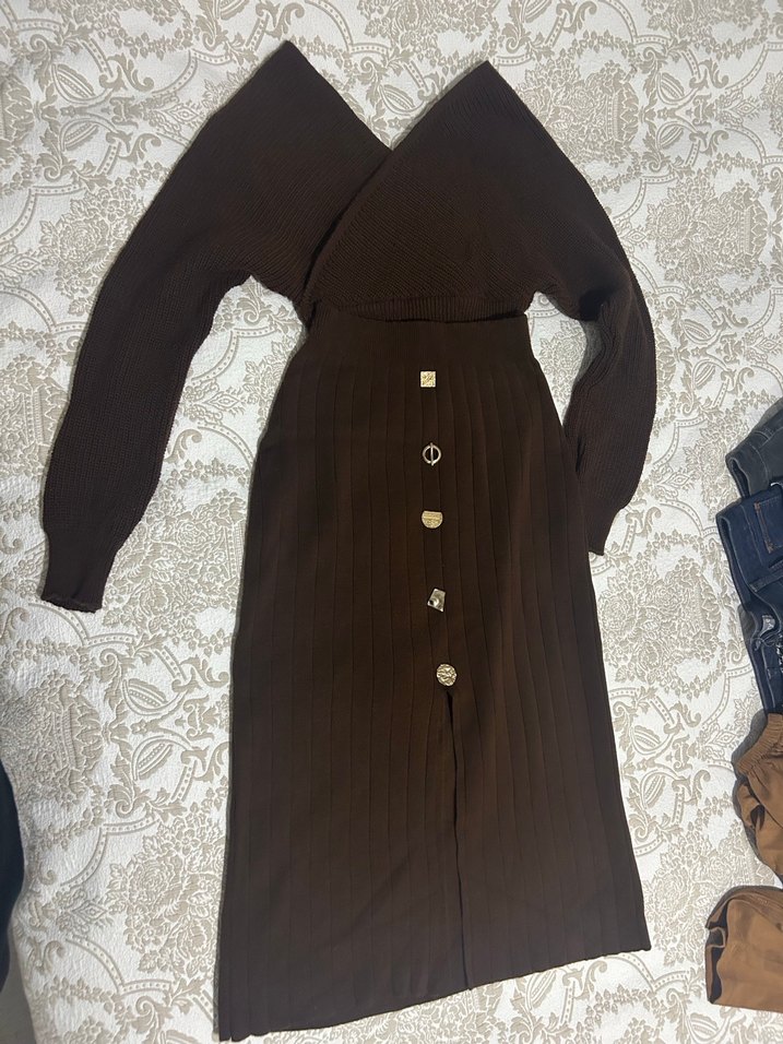 Kahverengi, düğmeli ve V yaka uzun triko elbise, klasik ve zarif bir görünüm sunar. Bohem Paris tarzıyla günlük kullanıma uygundur. Hiç kullanılmadı