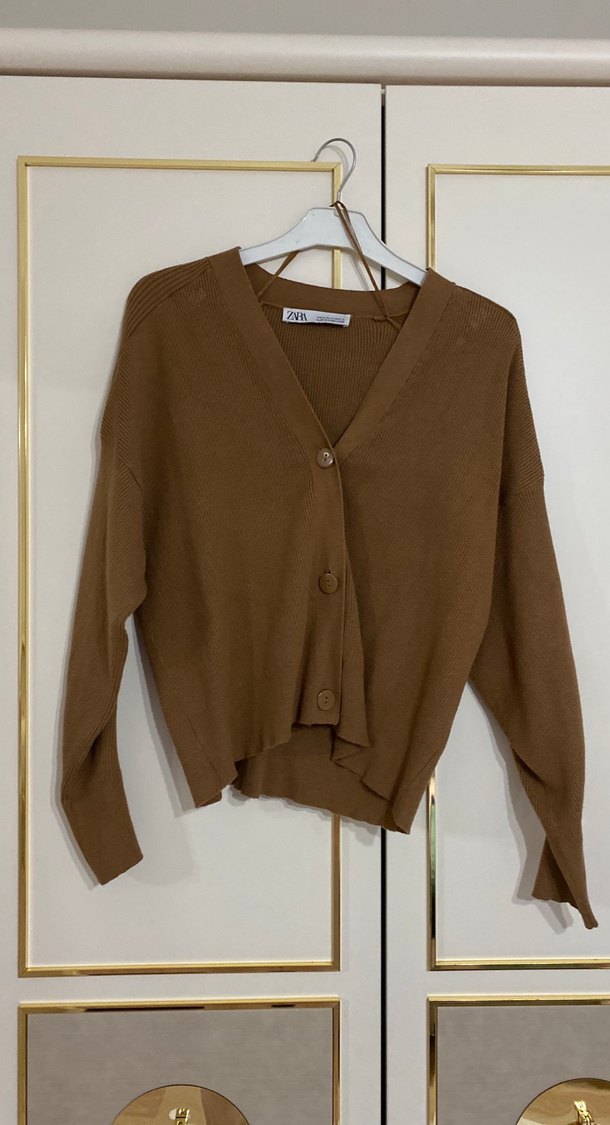 Bu kahverengi triko hırka, V yaka ve uzun kollu, rahat midi boy kesime sahiptir. Önde düğmeli, günlük kullanıma uygun rahat normcore tarzda bir üründür.