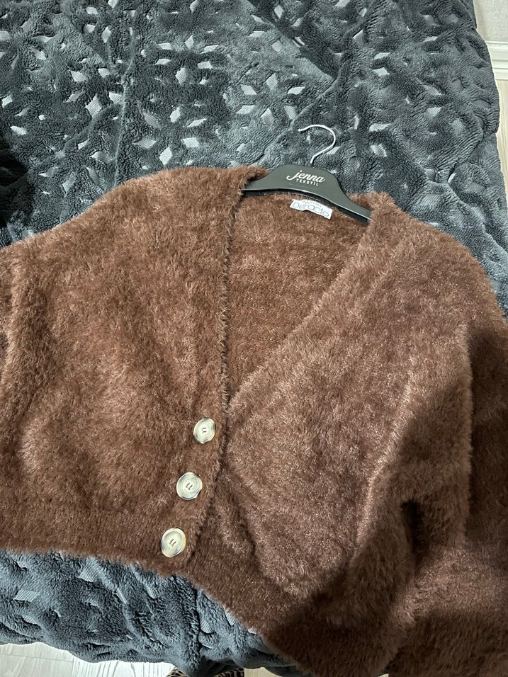 Kahverengi, düğmeli, V yaka, uzun kollu, bol kesim ve midi boyda triko kadın hırka. Rahat ve gündelik kullanım için uygundur.