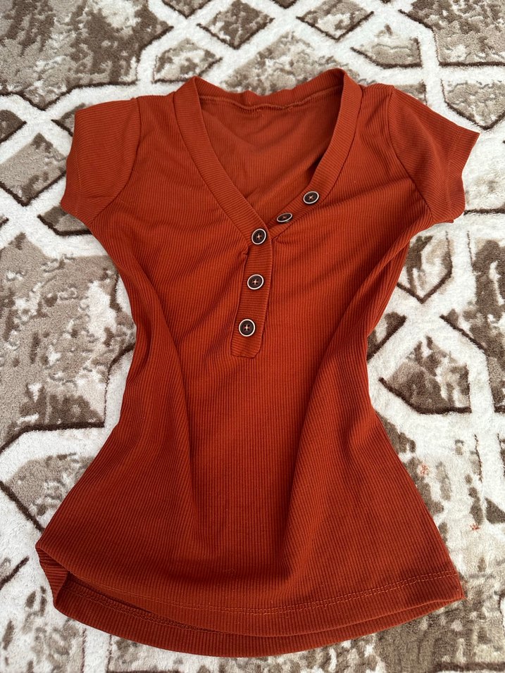 Düğmeli V yaka ve kısa kollu, fitted kesim kahverengi kadın tişörtü. Düz renk ve sentetik kumaştan, günlük sokak stili için uygundur.