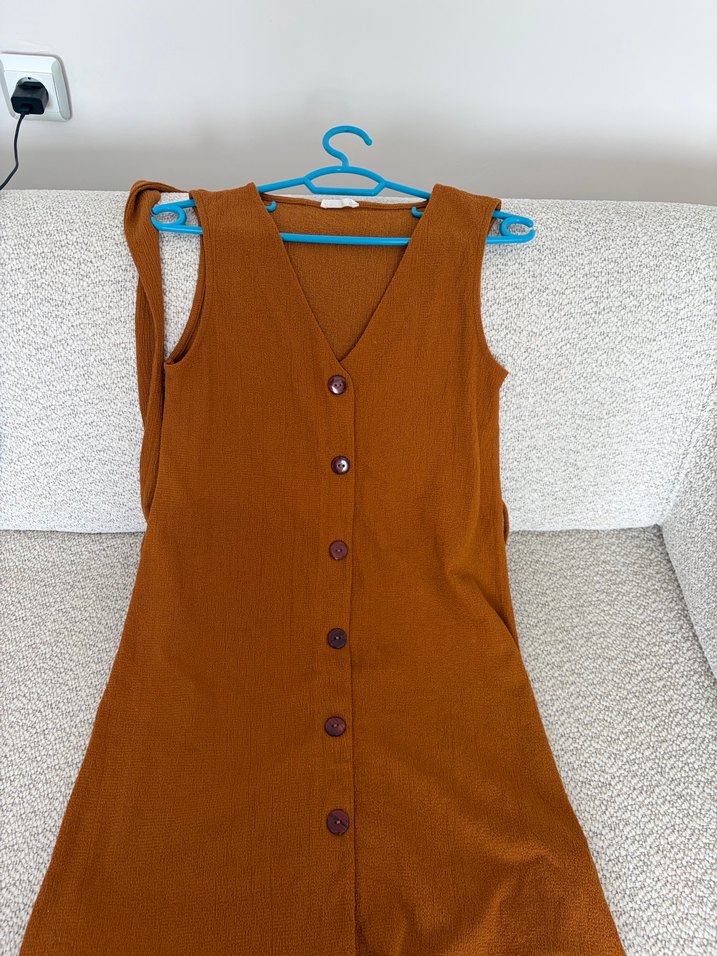 Düğmeli, V yakalı, kahverengi midi elbise, yumuşak sentetik kumaştan, rahat ve bol kesim, günlük sokak stili için uygundur.