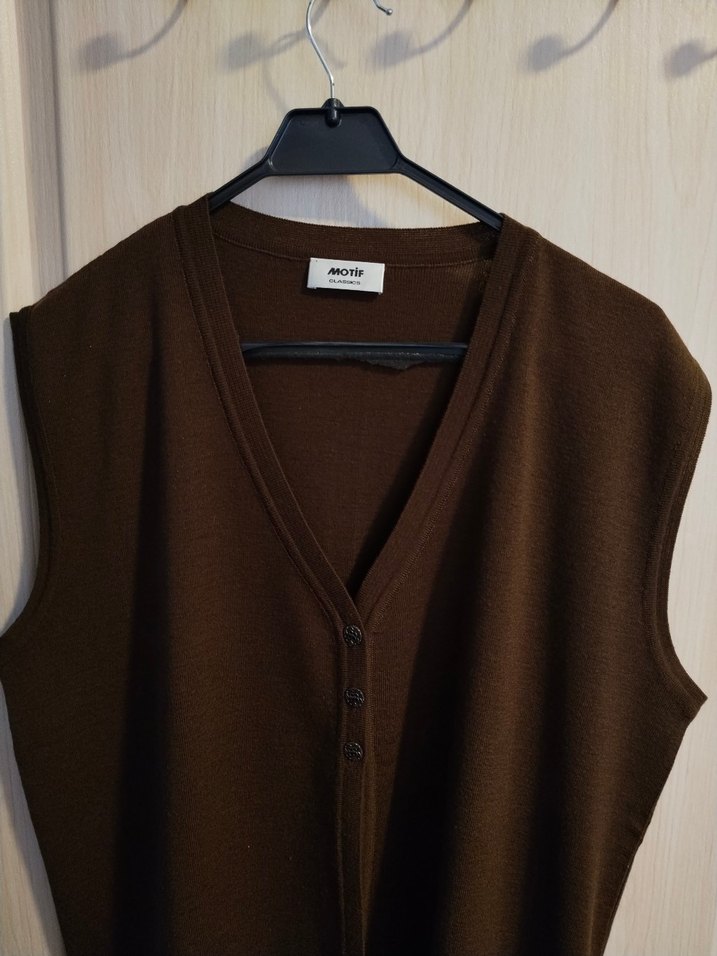 Düğmeli, V yakalı, kahverengi yün yelek, bol kesimli ve midi boyda. Minimalist normcore tarzda, günlük kullanıma uygun, kolsuz tasarım.