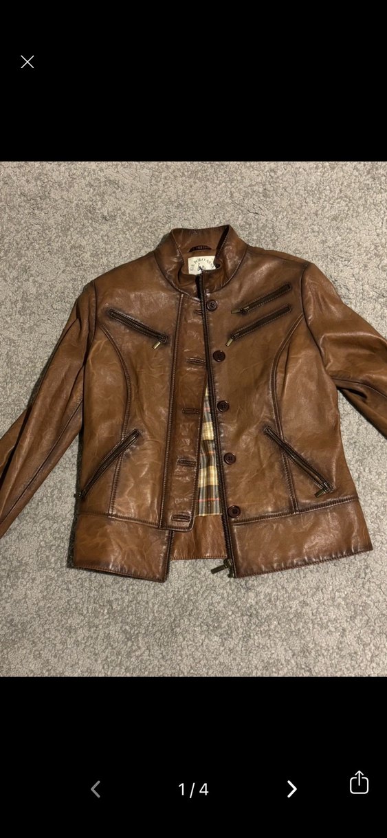 Düğmeli önü ve kesik yakası olan, kahverengi vintage biker tarzı deri kadın ceket. Uzun kollu, cep fermuarlı ve dar kesimdir. gerçek deri