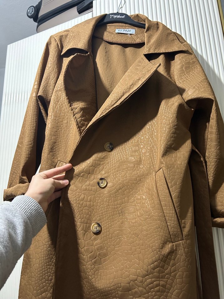 Kahverengi deri trençkot, parlak yılan derisi deseni, düğmeli ve kesik yaka. Salaş kesim, uzun kollu ve midi boy, trend sokak stili için uygun.