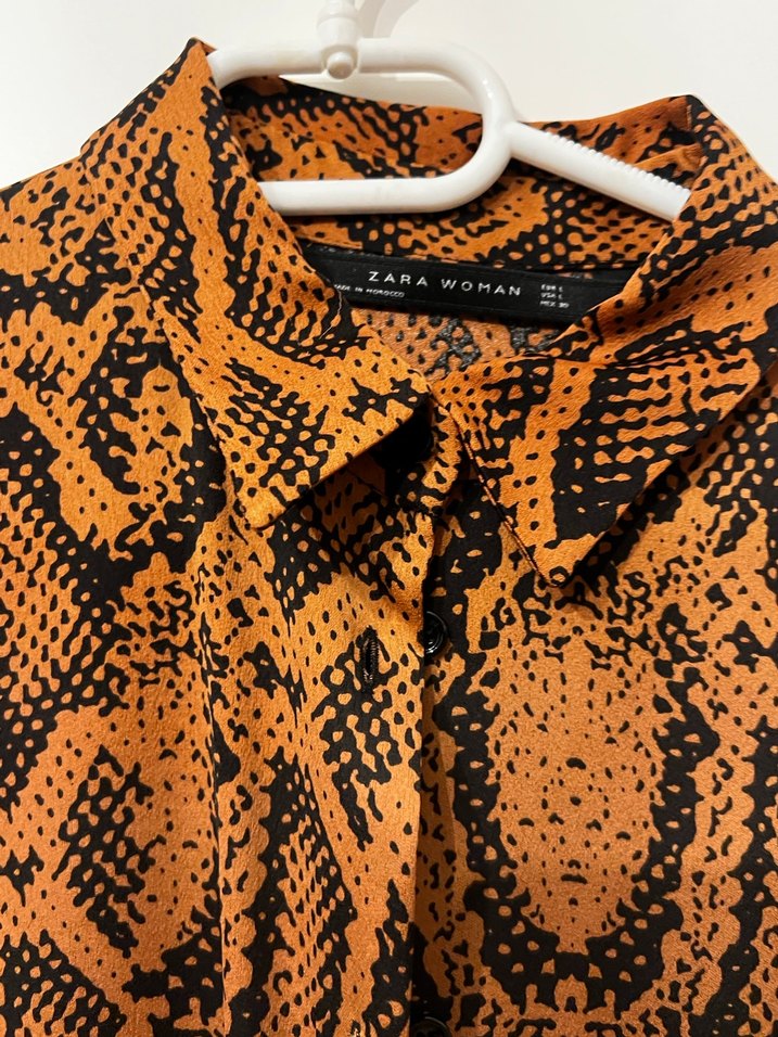 Kahverengi yılan desenli, düğmeli, sentetik kumaştan yapılmış, uzun kollu, yakalı ve midi boy bol kesim kadın gömlek.