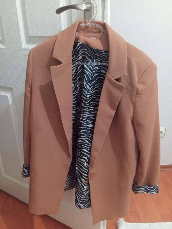 Düğmeli, kahverengi ve zebra desenli astarlı kadın blazer. Notch yaka, uzun kollu ve normal kesim. Parlak dokulu kumaştan, ofis kullanımına uygun.