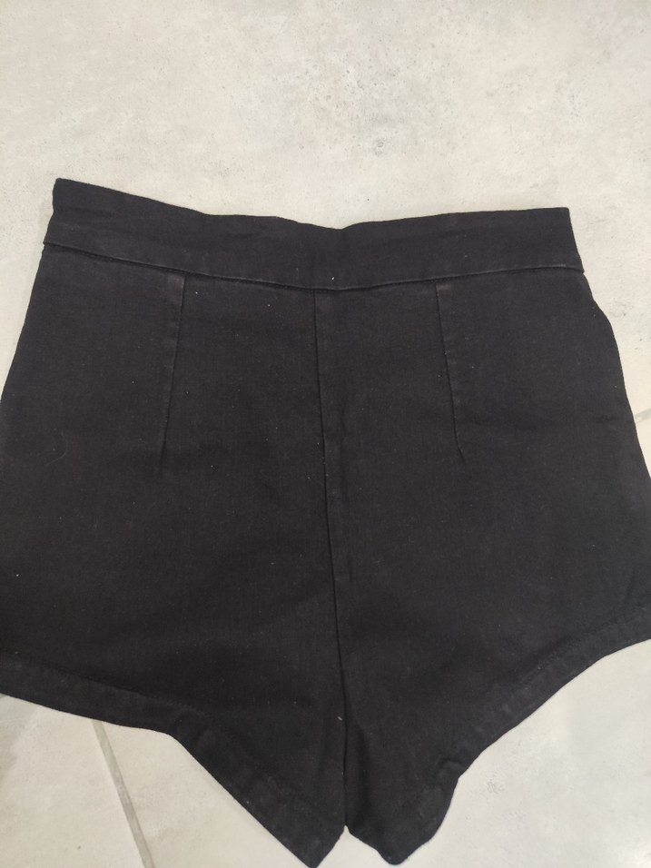 Düğmeli, siyah, kalçaya ve beli oturan vücudu saran yüksek bel mini şort, düz ve dar kesim. Pürüzsüz sentetik kumaştan, dış mekan sokak stiline uygun. ilk fotoğraf arkası ikinci fotoğraf önü uygulama üstü yer olarak algıladığı için fotoğrafların yerini değiştirdim