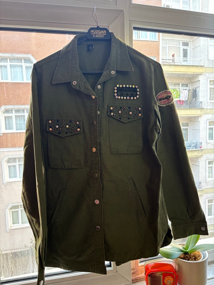 Yeşil kot ceket, düğmeli ön, yakalı ve uzun kolludur. Kamuflaj deseni, göğüs ceplerinde taş detayları ve kolda yama bulunur. Günlük kullanıma uygun, regular fit midi uzunluktadır.