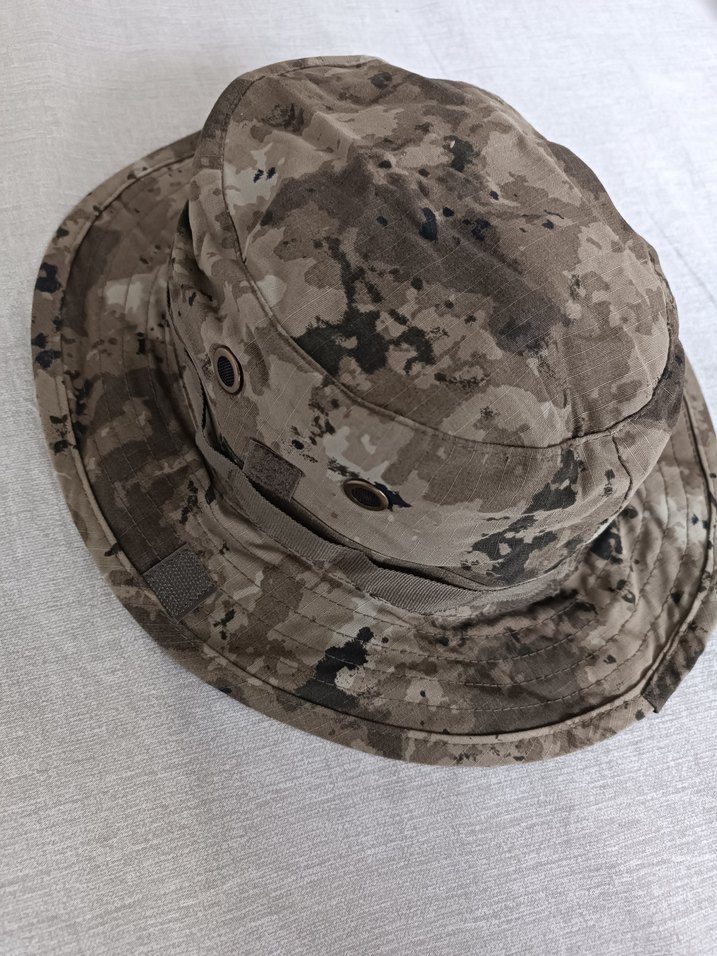 Kadınlar için düğmeli, gri ve kahverengi kamuflaj desenli, sentetik kumaştan yapılmış şapka. Sokak stili ve avangart görünüme uygun. 3 numara hiç kullanılmamış