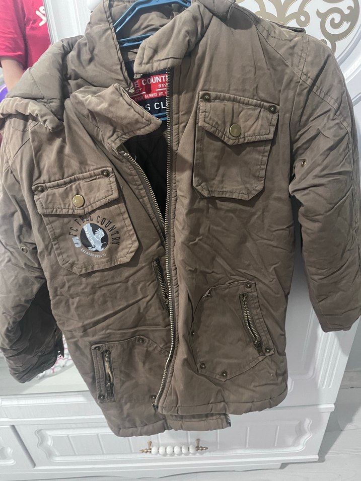Düğmeli cepleri ve kesimli yakası olan, yumuşak ve sıcak kumaştan yapılmış kahverengi ve gri kamuflaj desenli erkek çocuk montu.