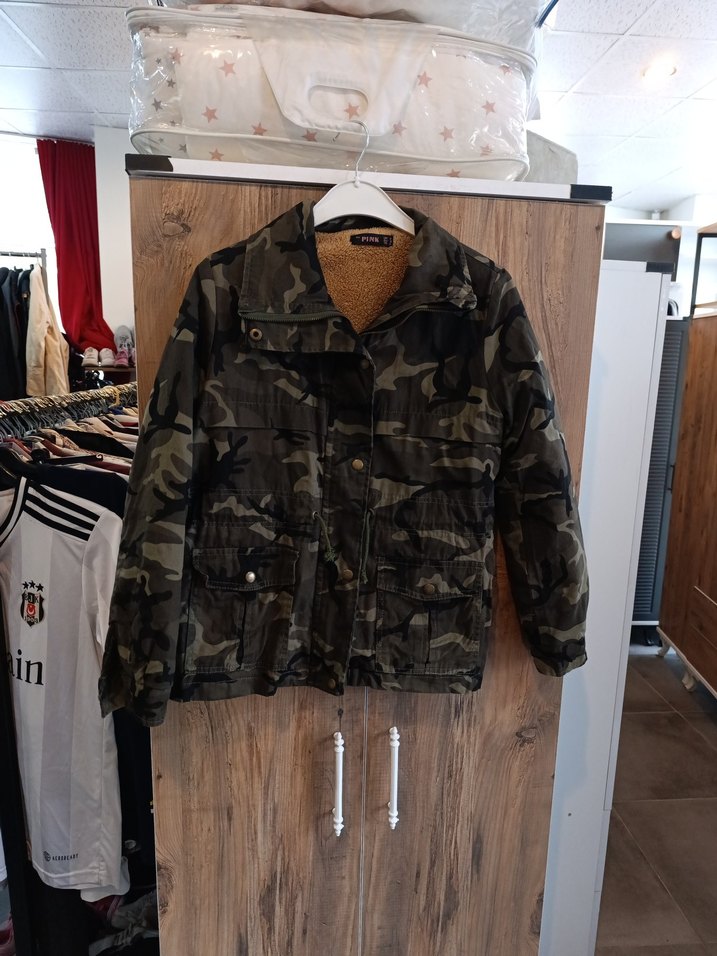 Koyu kahverengi kamuflaj desenli, düğmeli, uzun kollu, notched lapel yakalı kadın ceket. Rahat kesim, midi boy, yumuşak ve sıcak kumaştan, günlük sokak stiline uygun.