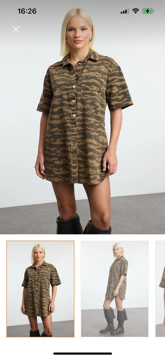 Kahverengi kamuflaj desenli, düğmeli, kısa kollu, bol kesim midi elbise, sentetik kumaştan, günlük rahat kullanım için uygun. Hiç kullanılmadı.