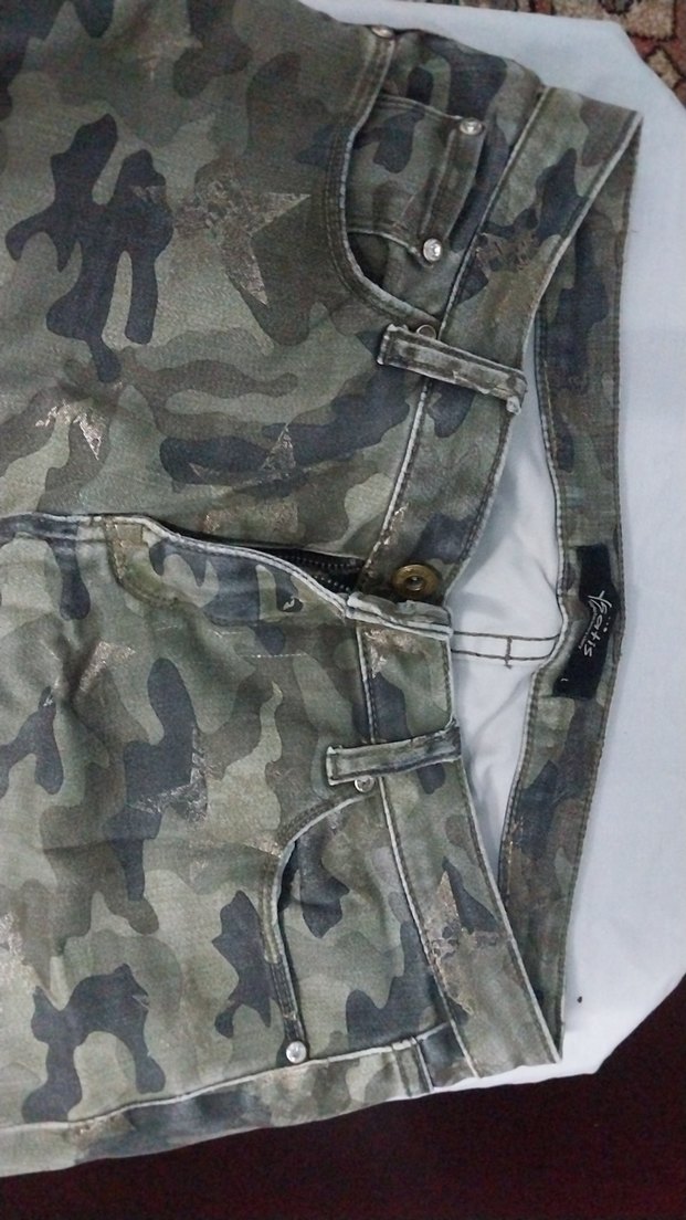 Gri haki kamuflaj desenli, sentetik kumaştan yapılmış, düğmeli, kadınlara özel midi uzunlukta dar kesim pantolon. Outdoor casual sokak stiline uygun.