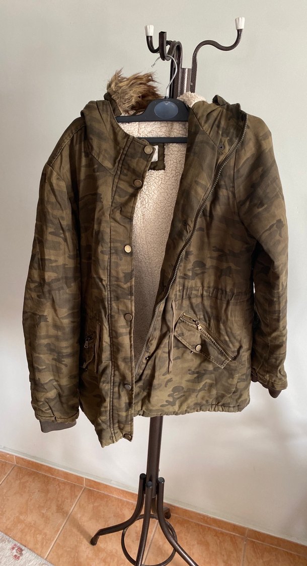 Kahverengi ve gri kamuflaj desenli, düğmeli, uzun kollu ve bol kesim kadın mont. Yumuşak ve sıcak fleece astarlıdır, dış mekan kullanımı için uygundur.