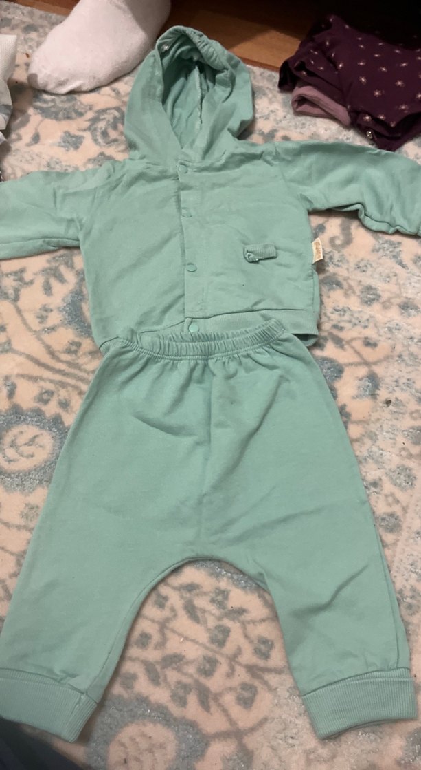 Düğmeli, kapüşonlu ve uzun kollu üst ile rahat, yumuşak kumaştan pastel yeşil pantolondan oluşan bebek erkek takımı. Desensiz ve sade sokak stili.