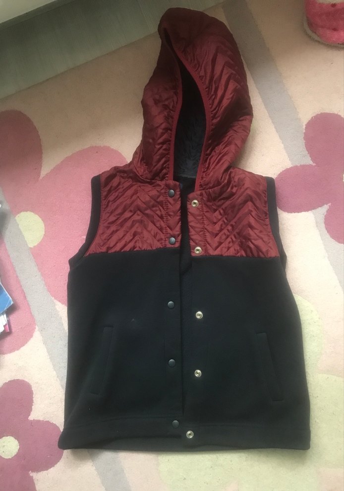 Düğmeli, kapüşonlu ve yüksek yakalı bu kadın yeleği, bordo ve siyah renkleriyle sade ve şık bir görünüm sunar. Yumuşak ve sıcak kumaştan, günlük kullanıma uygundur. Ufak bir lekesi mevcut.