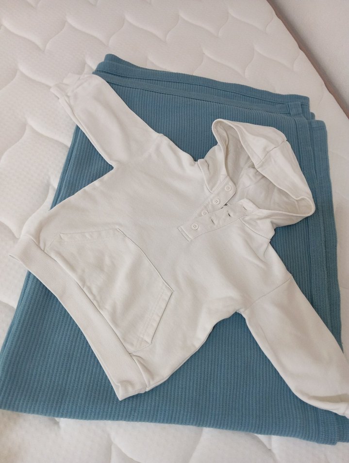 Düğmeli kapüşonlu, uzun kollu ve bol kesim erkek çocuk beyaz sweatshirt, yumuşak ve sıcak kumaştan üretilmiştir.