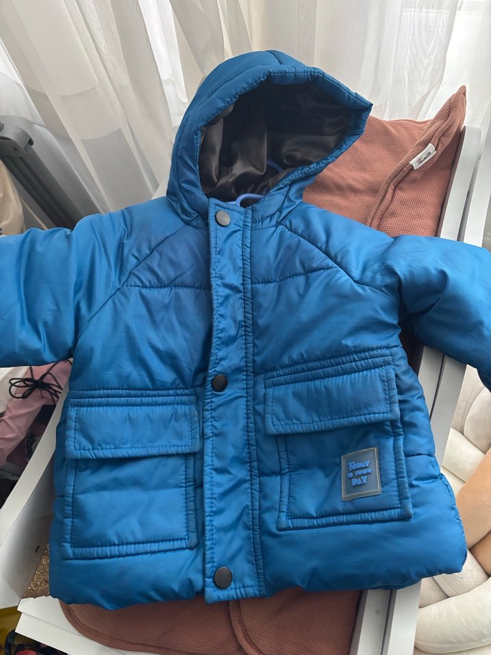 Düğmeli ve kapüşonlu, koyu mavi renkli erkek çocuk montu. Hiçbir deformesi yoktur 12/18/24 ay uyumludur