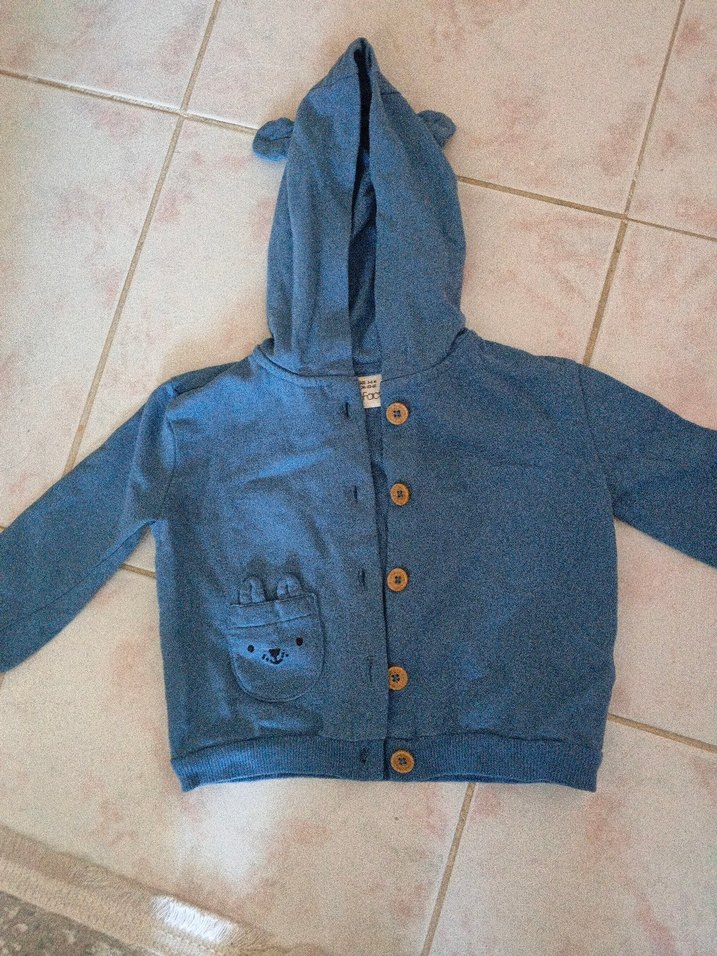 Mavi renk, düğmeli, kapüşonlu ve uzun kollu erkek çocuk sweatshirtü. Yumuşak ve sıcak kumaştan, bol kesimlidir. Cepten küçük ayı detaylıdır. Rahat ve günlük kullanım için uygundur. alındığında icinde iplik vardı resimde belirtildi