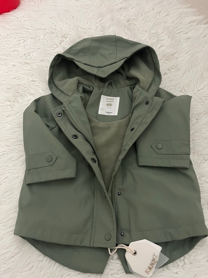 Kapüşonlu, düğmeli ve gri yumuşak kumaştan yapılmış, bol kesim erkek çocuk yağmurluğu. Sokak stili için uygundur.24 ay a kadar olur sıfır ürün