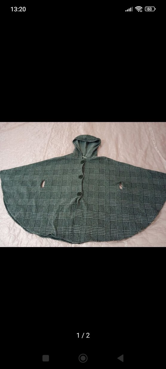 Düğmeli kapüşonlu, uzun kollu, gri kareli kadın panço. Rahat ve sıcak dokusu ile günlük sokak stiline uygundur. kemeri yoktur