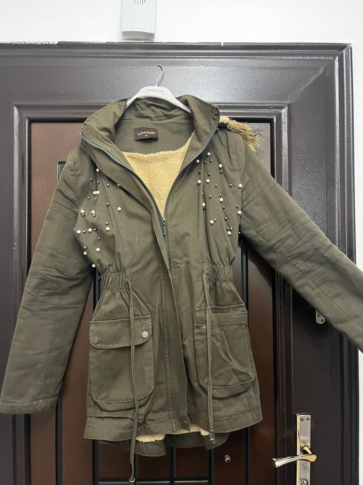 Düğmeli, kapüşonlu ve uzun kollu haki renkli, içi yumuşak astarlı kadın ceket. Büyük cepleri ve süslemeleriyle günlük kullanıma uygun.