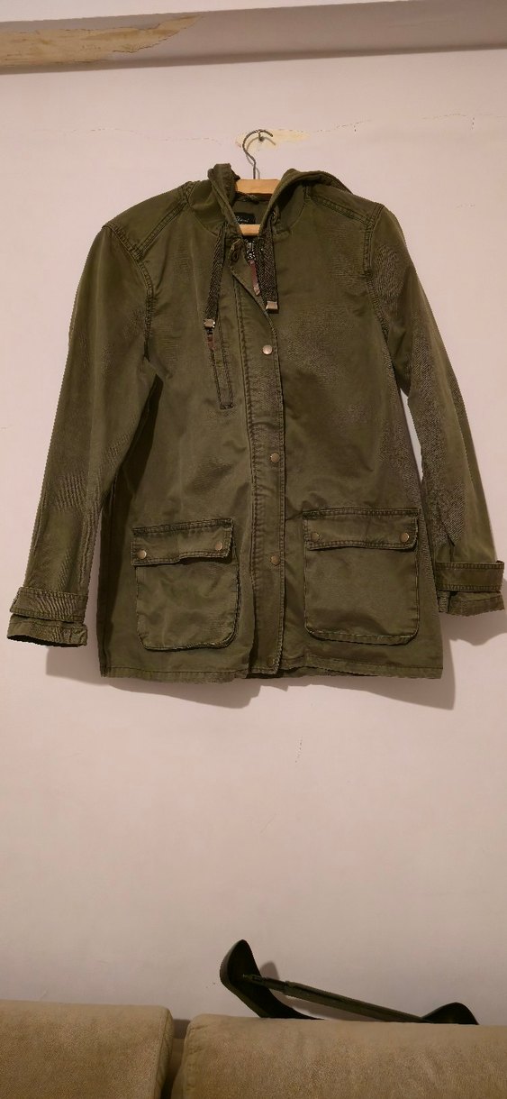 Düğmeli, kapüşonlu haki renk kadın ceket. Uzun kollu, bol kesim ve midi boy. Denim kumaştan, günlük sokak modasına uygun.