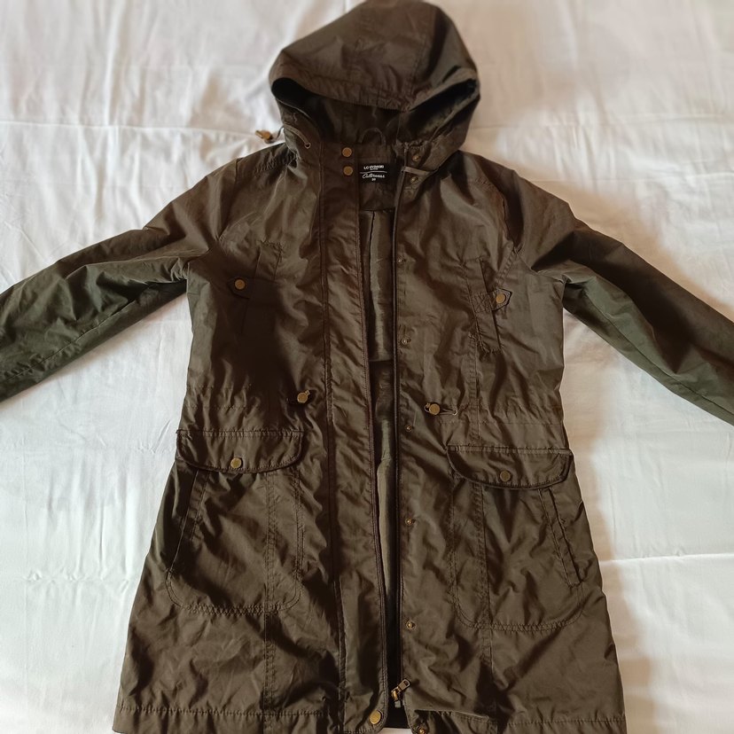 Düğmeli, kapüşonlu, uzun kollu midi ceket. Sentetik kumaştan, dar kesimli ve sokak stiline uygun bir tasarıma sahiptir. Bir kaç kez giyildi tertemiz