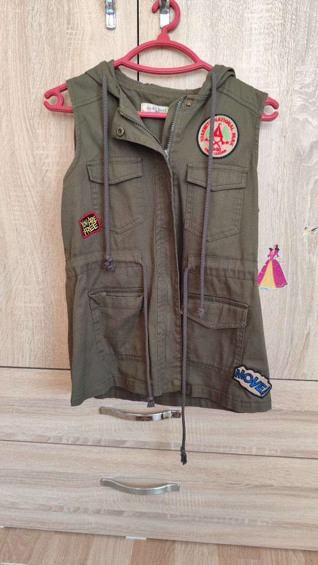 Düğmeli, kapüşonlu, kolsuz kadın midi yelek. Rahat kesim, çoklu cep ve günlük sokak stili için uygun yamalar içerir. kadın ceket az kullanıldı kusuru yok marka temsili