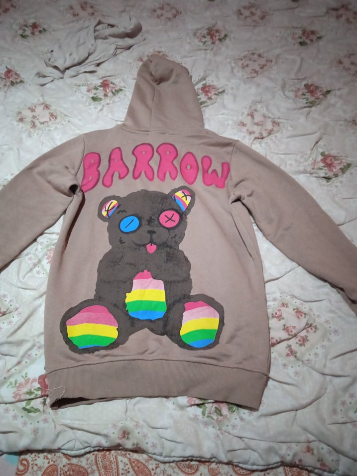 Kahverengi kapüşonlu, uzun kollu ve bol kesim sweatshirt. Renkli ayı baskısı ve düğme detayları ile sokak stiline uygun. Üzerinde 'BARROW' yazısı bulunur.