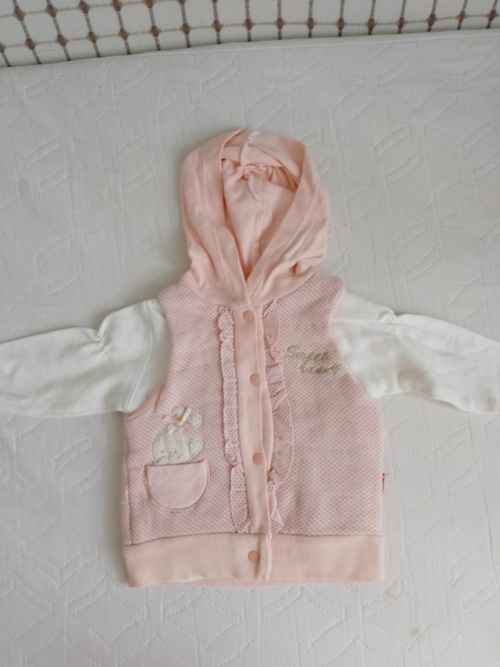 Düğmeli, kapüşonlu ve uzun kollu pembe kız çocuk yeleği, işlemeli detaylar ve küçük cep ile rahat bir kumaşa sahiptir.