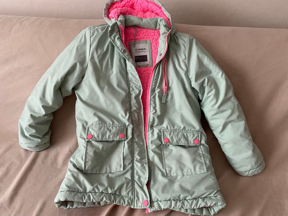 Düğmeli, kapüşonlu kız mont, pastel pembe dış yüzey ve canlı pembe yumuşak astarla. Cep detaylı, sokak stiline uygun