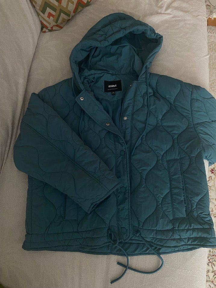 Düğmeli ön kısmı ve kapüşonu olan koyu mavi kadın ceketi. Uzun kollu, bol kesim ve notlu yaka detaylarıyla rahat ve gündelik stil sunar. Orta uzunlukta, yumuşak ve sıcak kumaştan üretilmiştir. SADECE BİR KEZ KULLANILDI YENİDEN FARKSIZ #mavi #ceket #mont