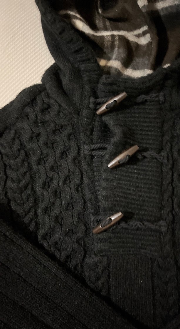 Düğmeli önü ve kapüşonu olan,siyah renkte yumuşak yünlü fitted kesim uzun kollu erkek kazak. Rahat ve desenli örme yapıya sahiptir. Bir kere ya da iki kere giyilmiştir