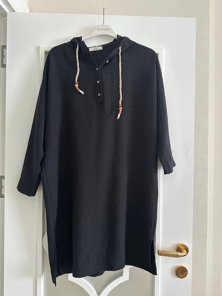 Nefes alabilen keten kumaştan siyah uzun tunik, kapüşonlu ve düğmeli, rahat kesimiyle günlük kullanıma uygundur. Kusuru son fotodadır.