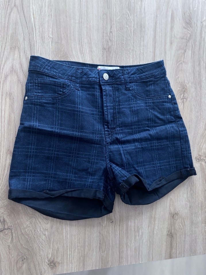 Düğmeli, kare desenli koyu mavi mini kot şort. Rahat kesimiyle günlük sokak stiline uygundur.
