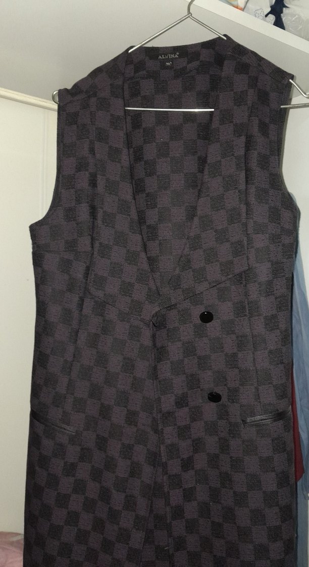 Düğmeli ve kolsuz gri kadın yeleği, kesik yakalı ve midi boyda. pamuklu kumaştan, kareli desene sahip, günlük ve iş stiline uygun.
