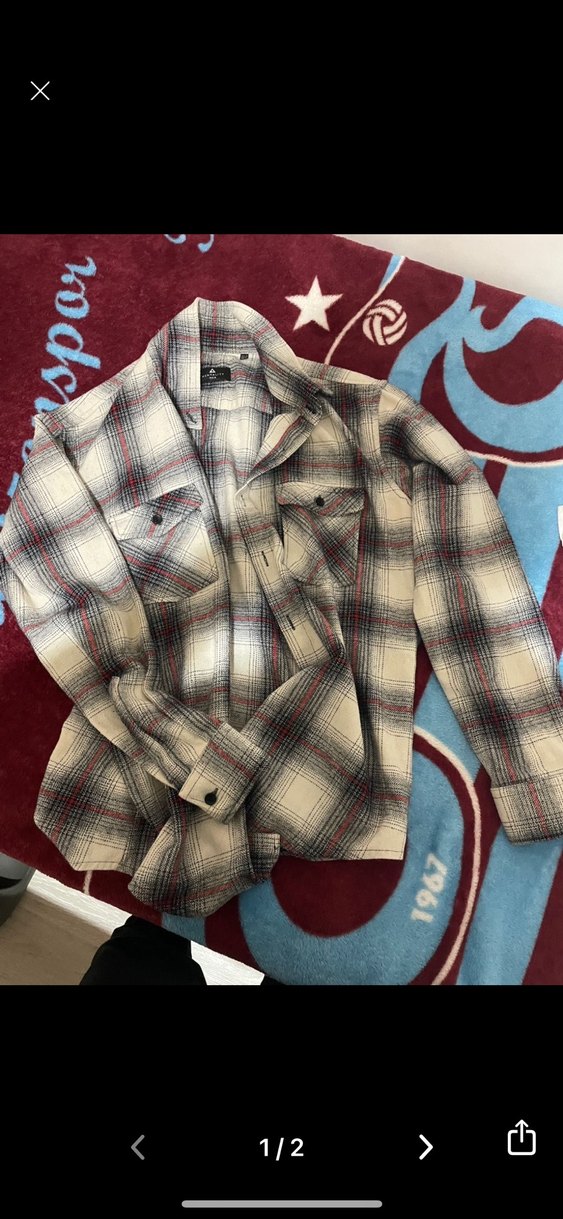 düğmeli, yakalı ve uzun kollu pamuklu gömlek. Gri ve kahverengi kareli desene sahip, normal midi boyda ve rahat kesimlidir.