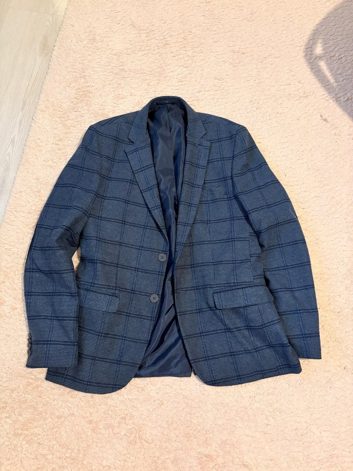 Düğmeli, kareli desenli koyu gri erkek takım ceketi. Notlu yaka, normal uzunluk ve uzun kolludur. Ofis ve günlük şıklık için uygundur.