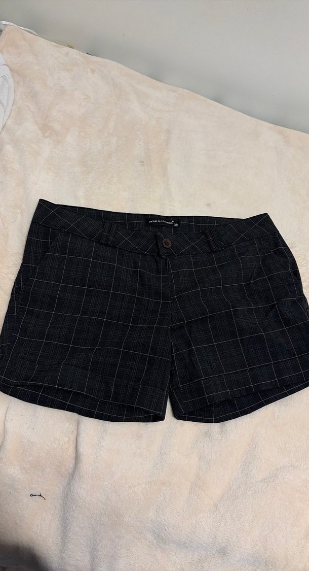 Gri kareli kot kumaştan, düğmeli ve bol kesim mini şort, günlük rahat kullanım için uygundur.