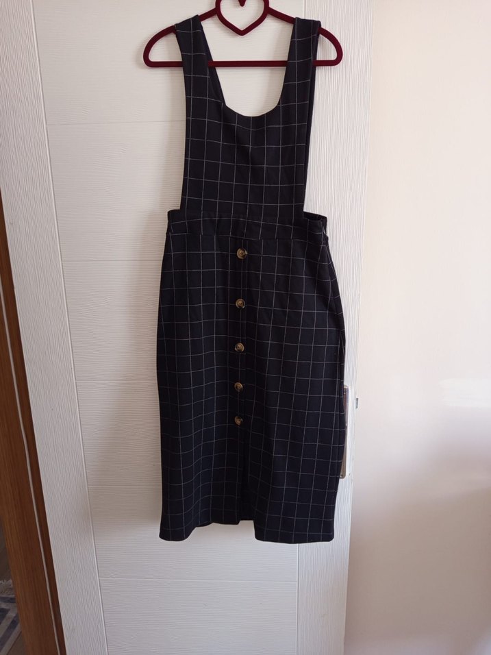 Gri kareli, düğmeli ön detaylı, sentetik kumaştan yapılmış düzenli kesim hamile midi eteği. Sokak modası tarzında, rahat ve şık görünüme sahip.