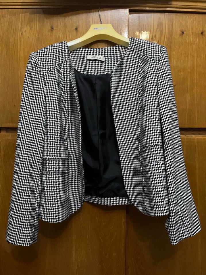 Düğmeli önü, kareli deseni ve normal uzunlukta kolu olan koyu siyah beyaz kadın blazer ceket. Ofis ve günlük kullanıma uygundur.