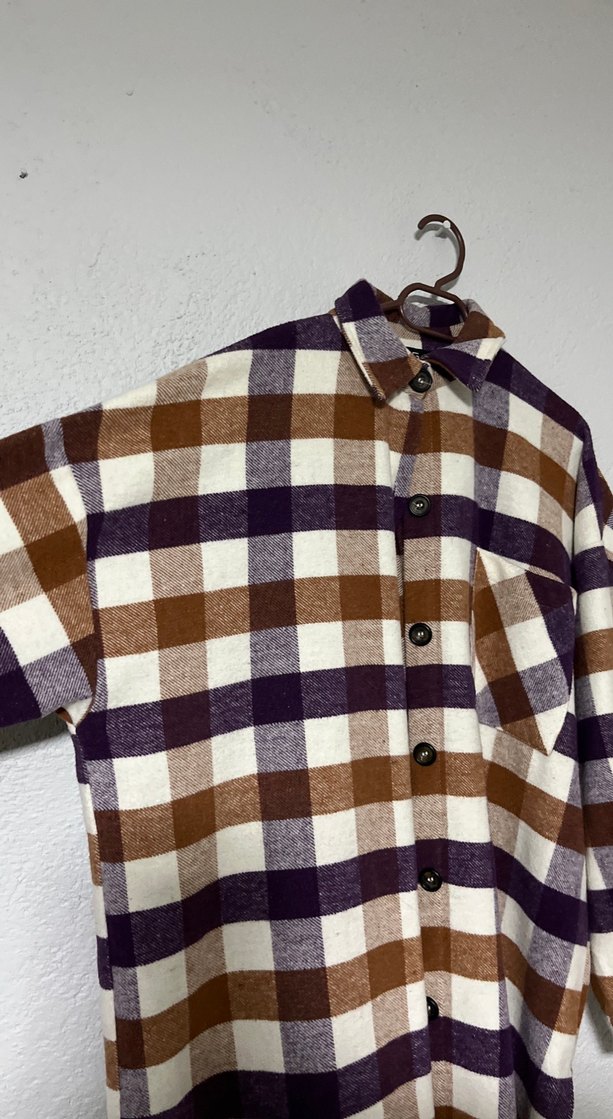 Düğmeli, yakalı ve uzun kollu bol kesim kadın gömlek. Kahverengi ve mor tonlarında koyu kareli desenlidir. Günlük sokak stiline uygundur.