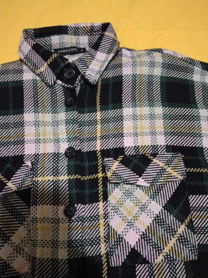 Düğmeli, yakalı ve bol kesimli kadın gömlek. Sentetik kumaştan, koyu renkli çok renkli kareli desenli, uzun kollu, günlük kullanıma uygun. Kalın ve tok kumaş.