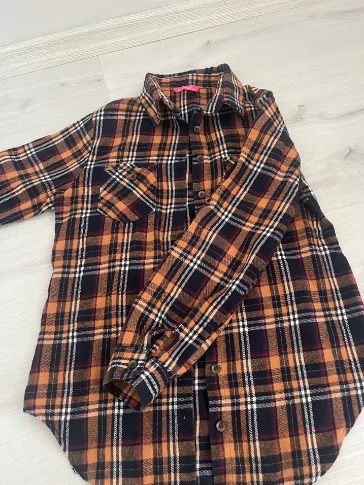 Düğmeli ve yakalı, uzun kollu, bol kesim kadın gömlek. Koyu kahverengi kareli deseni ve rahat tekstil kumaşıyla günlük sokak stiline uygundur.