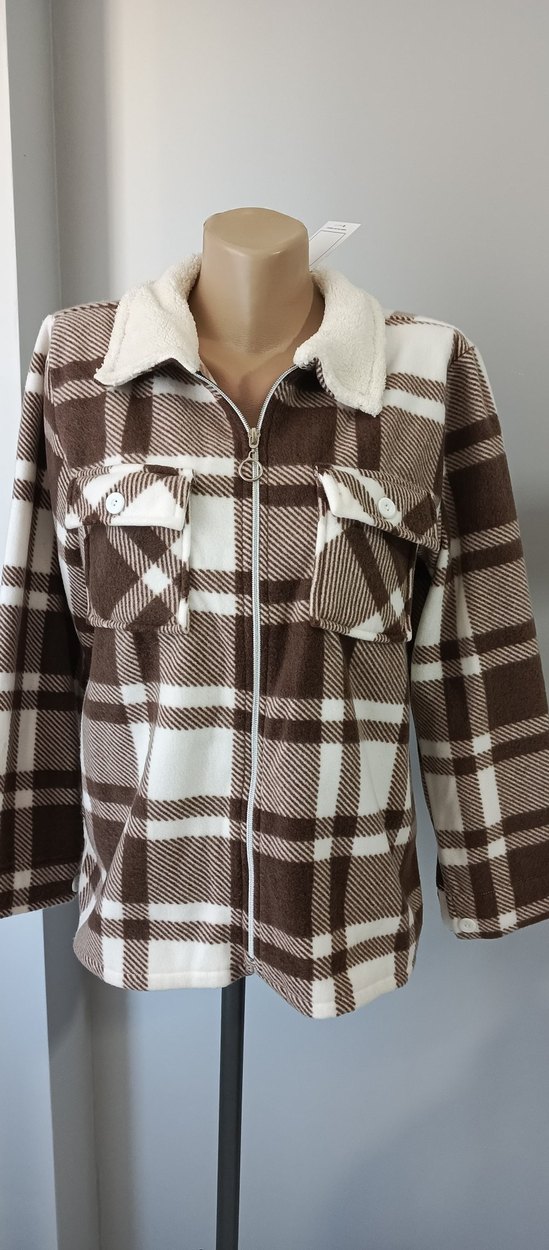 Kahverengi ve gri kareli, uzun kollu, düğmeli cepli, yakalı, yumuşak ve sıcak kumaşlı, bol kesim kadın gömlek ceketi.