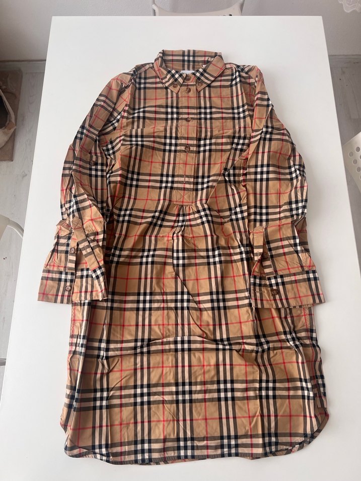 Düğmeli, kareli ve kahverengi uzun kollu gömlek elbise. Yakalı, bol kesim ve midi boy, sentetik kumaştan, günlük rahat sokak stili için uygundur.
