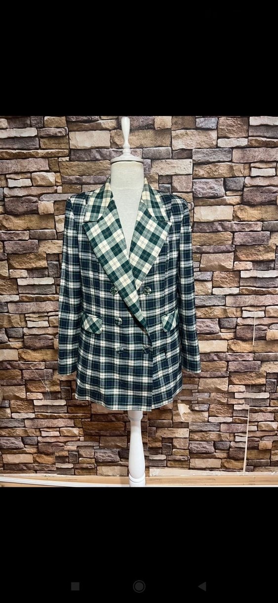 Düğmeli, kareli ve uzun kesim kadın blazer ceket. Notlu yaka ve uzun kollu, vintage tarzda, ofis için uygun çok renkli koyu tonlarda.