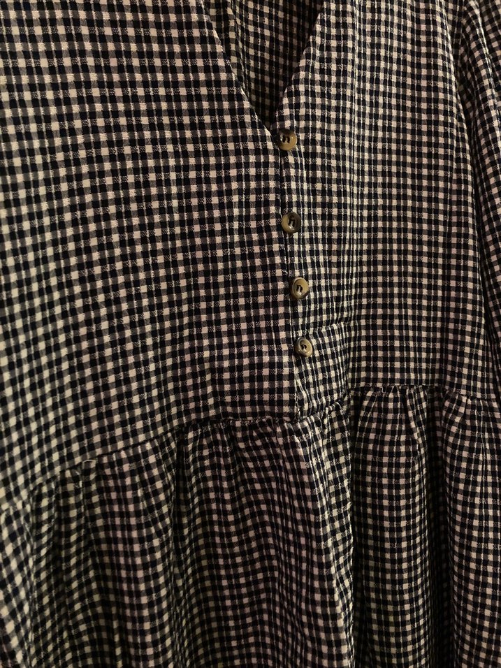 düğmeli standart beden hamileler için de uygun elbise V yaka ve uzun kollu, kareli desenli, bol kesimdir. Sentetik kumaştan yapılmış, normal midi boydadır, günlük kullanıma uygundur.